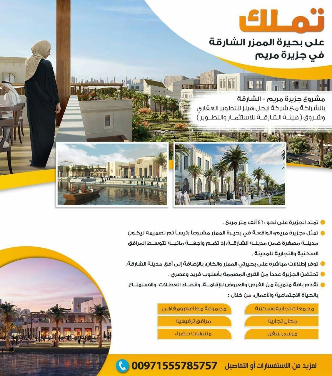 https://i.suar.me/8PK36/l مشروع جزيرة مريم – الشارقة بالشراكة مع شركة ايجل هيلز للتطوير العقاري وشروق ( هيئة الشارقة للاستثمار والتطوير ) جزيرة مريم تعتبر الجزيرة أكبر المشاريع الثلاثة من حيث القيمة والمساحة، وهو مشروع متعدد الاستخدامات تصل تكلفته التطويرية إلى 2.4 مليار درهم، وتمتد الجزيرة على نحو 460 ألف متر مربع، تم تخصيص 310 آلاف متر مربع منها للبناء. وتمثل «جزيرة مريم» الواقعة في بحيرة الممزر مشروعاً رئيساً تم تصميمه ليكون مدينة مصغرة ضمن مدينة الشارقة، إذ تضم واجهة مائية تتوسط المرافق السكنية والتجارية للمدينة، توفر إطلالات مباشرة على بحيرتي الممزر والخان، بالإضافة إلى أفق مدينة الشارقة. وتحتضن الجزيرة عدداً من القرى المصممة بأسلوب فريد وعصري، وتقدم باقة متميزة من الفرص والعروض للإقامة، وقضاء العطلات، والاستمتاع بالحياة الاجتماعية والأعمال، إلى جانب القيام بالأنشطة المجتمعية اليومية رفقة العائلة والأصدقاء، من خلال المجمعات التجارية والسكنية، ومجموعة المطاعم والمقاهي، والمحال التجارية والمرافق الترفيهية ومرسى السفن، والمتنزهات الخضراء. #sharjah #apartments #uae #dubai للتفاصيل الرجاء الإتصال أو الواتساب على الرقم 00971555785757 |