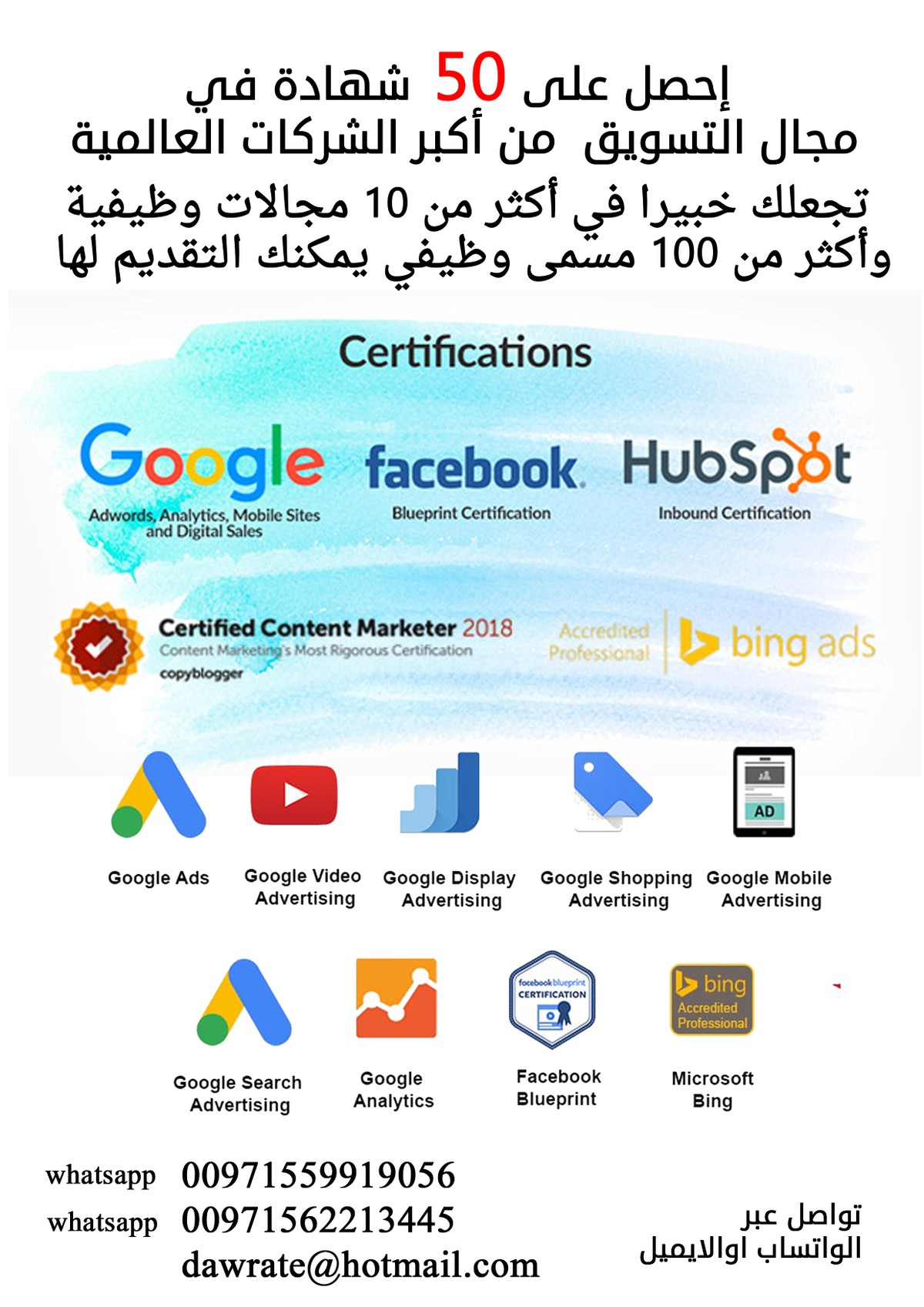 Google| Microsoft | HubSpot | SEMrush | YouTube | Facebook للمحترفين في مجال التسويق الالكتروني و الراغبين في تطوير مسيرتهم المهنية والترقية في وظائفهم الآن *إحصل على 50 شهادة عالمية من أكبر وأفضل الشركات المتخصصة في مجالات التسويق الرقمي* بكافة أقسامه ( *التسويق الرقمي* – *إدارة الحملات الإعلانية* – *تحليل البيانات* – *التسويق باستخدام الفيديو* – *التسويق بالايميل* - *احتراف السيو للمواقع* ) ماذا تستفيد عند الحصول على الشهادات •زيادة فرص حصولك على وظائف ذات مرتبات عالية جدا في شركات كبرى •تعدد الفرص الوظيفية •امكانية تقديم نفسك كخبير في اكثر من 50 مجال رقمي •امكانية تقديم خدماتك كخبير مستقل في عالم الاعمال * •امكانية تقديم خدماتك الاستشارية العملية للمؤسسات الراغبة بتطوير علامتها التجارية رقميا* •انهاء الجدل حول شهاداتك المصدقة من مكان ما او جهة ما لان الشهادات عالمية وتستطيع مشاركة بروفايلك للجميع حتى *يمكنهم التحقق من شهاداتك بانفسهم* من خلال جوجل او يوتيوب او اي منصة اخري •الارتقاء من مستوى مستخدم عادي في هذه المجالات الى المستوى الاحترافي •نقدم لك باقات متميزة وبسعر لا يقب المنافسة* •تدعيم سيرتك الذاتية بشهادة ذات جودة عالمية بكسبك احترام الشركات* والحصول على عروض وظيفية أفضل •أكثر من 100 مسمى وظيفي يمكنك استخدامه لسيرتك الذاتية مما يعطيك فرص غير محدودة للتوظيف قائمة بالشهادات التي تحصل عليها *G-Marketing Platform* • Campaign Manager Cert • Creative Cert • Display & Video 360 Cert • Search Ads 360 Cert *G-Smart Assessment* • Measurement – Smart Assessment • Performance – Smart Assessment • Platforms – Smart Assessment • Video – Smart Assessment *G-Waze* • Waze Local Fundamentals Assessment • Waze Local Advanced Assessment *G-Jamboards* • Deploying Jamboards Assessment • Selling Jamboards Assessment *YouTube* YouTube Channel Growth • YouTube ******* Ownership • YouTube Asset Monetization *G-Analytics* • G-Analytics For Beginners Advanced G-Analytics • G-Analytics for Power Users • Getting Started With G-Analytics 360 *Yandex* • Yandex Metrica Cert • Yandex Direct Cert *G-Ads Cert* • G-Ads Fundamentals • G-Analytics Individual Cert • G-Ads Display Cert • G-Ads Mobile Cert • G-Ads Search Cert • G-Shopping Cert • G-Ads Video Cert • G-Mobile Sites Cert • G-Digital Sales Cert *G-Digital Garage* • G-Digital Garage *HubSpot Cert* • Inbound Cert • Social Media Cert • E-mail Marketing Cert • Inbound Marketing Cert • ******* Marketing Cert • Sales Enablement Cert • Inbound Sales Cert • Growth-Driven Design Cert • Growth-Driven Design Agency Cert *SEMrush Cert* • SEMrush SEO Toolkit Cert • SEMrush ******* Marketing Toolkit • SEMrush Advertising Toolkit Cert • SEMrush Affiliate Program Terms Cert • SEMrush Social Media Toolkit Cert • SEMrush SEO Fundamentals Cert • SEO Toolkit Exam for Advanced SEMrush Users • SEMrush Technical SEO Cert • SEMrush PPC Fundamentals Microsoft Bing Bing Accre *لأية استفسارات الرجاء التواصل عبر الواتساب فقط* ما هى أشهر أدوار ووظائف التسويق؟00971559919056 | 00971562213445 | dawrate@hotmail.com https://www.facebook.com/Dawrate/ مجموعة من أهم و أشهر المسميات الوظيفية والادوار فى التسويق: • متخصص التسويقMarketing specialist . • فى تسمية مشابهة: منسّق تسويق - Marketing coordinator): بيظهر الدور ده اكتر فى الشركات الخدمية زى شركات الIT، وبيبقى دوره فى نطاق الترويج وبالذات تطوير الحملات الاعلانية للشركة، والتسويق الالكترونى. • مندوب تسويقMarketing Rep :. • المسمّى ده يكاد يكون اختفى دلوقتى، لان الشركات كانت بتقولك هتشتغل مندوب تسويق، لكن فى الحقيقة انت بتشتغل فى البيع، وعشان كده بقى فيه مسميات تحت وظايف البيع بديلة عنّه. • متخصص تطوير اعمال Business development specialist: • ده اختراع جديد كده دخلته الشركات عشان يبقى دور يشمل التسويق والبيع فى نفس الوقت، بتلاقى برضه الدور ده اكتر فى شركات الخدمات. وصاحب الوظيفة دى بيبقى جوكر فى المكان. • تنفيذى حسابات او مدير حسابات Account Executive (Account Manager): • اوضح مثال عشان تفهم المسمى الوظيفى ده هو انك تشوفه فى شركات وسيطة زى شركات الدعاية والاعلان. صاحب الدور ده بيبقى معاه كذا اكونت (شركة - عميل) من اول ما بيبدأ يدور عليهم ويفتح معاهم شغل، لحد ما بيفضل يتابعهم ويحللهم كل مشاكلهم. الدور ده فى نطاق البيع (جزء من ادوار التسويق). • مندوب بيع Sales rep: o بيظهر فى شركات المنتجات زى شركات الاغذية، وبيبقى مسئول انه يضمن وصول المن