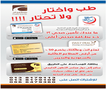 أقوى بطاقات الخصومات في السعودية من مؤسسة طريق الخير https://i.suar.me/Erdd8/l --- بطاقة صحتي أغلى هي بطاقة تقدم خصومات منوعة ومفصلة في المجال الصحي من المستشفيات والمستوصفات والمختبرات ومراكز التجميل والجلدية ، ومن الجهات المختلفة التي تهتم بالصحة بمافيها الأندية الرياضية ، ويستفيد منها المواطنين الذين لا توجد لهم تغطيات تامينية وخاصة المتقاعدين المدنين والعسكريين والمقيمين بصورة قانونية . قيمة العضوية السنوية : 200 ريال ، يحصل على بطاقة صحتي أغلي والدليل الخاص بمقدمي الخدمات في المملكة العربية السعودية لاكتشاف مميزات البطاقة حمل التطبيق الخاص بها https://play.google.com/store/apps/d...healthcarecard --- بطاقة ديلي ديل الخاصة بالمطاعم مفهوم جديد لتنشيط السياحة في دول مجلس التعاون الخليجي مع برنامج العروض اليومية ( ديلي دييل ) 1 – تشجيع العائلات علي السياحة الداخلية بين دول مجلس التعاون الخليجي 2- وافقت المطاعم على المشاركة في دعم السياحة بين دول مجلس التعاون الخليجي من خلال تقديم خصم 50 % علي المأكولات والمشروبات لزوار الفنادق حاملي عضوية بطاقة ( الديلي دييل ) 3- سوف يشارك الكثير من الفنادق من دول مجلس التعاون الخليجي في هذا البرنامج لتنشيط الحركة لدي مطاعمهم. 4- حاملي عضوية ( الديلي دييل ) سيتمتعون بتناول وجباتهم من فطور وغداء وعشاء في المطاعم المشاركة حسب ماهو مبين في الصفحات الخاصة بكل فندق. 5- كل يوم من أيام الاسبوع يوجد لديك العديد من مطاعم الفنادق أينما كنت لتتمتع بتناول مختلف انواع الأكلات بصحبة عائلتك. قيمة العضوية السنوية : 500 ريال ، يحصل على بطاقة ديلي دييل والدليل الخاص بمقدمي الخدمات في المملكة العربية السعودية . ** اقتنص الفرصة خلال شهر ابريل اطلب بطاقة خصم ديل دييل و احصل على ثانية لصديق مجانا ** التعليمات عزيزي حامل بطاقة ديلي دييل : 1 – الحد الأقصى لضيوف مع كل حامل بطاقة 6 البالغين. 2 – يفضل الحجز مقدما. 3 – خلال شهر رمضان الخصم سوف يكون حسب سياسة الفندق 4 – يحتسب الخصم من إجمالي الفاتورة. 5 – يتم استخدام البطاقة في حضور صاحبها فقط. لاكتشاف مميزات البطاقة حمل التطبيق الخاص بها https://play.google.com/store/apps/d...eww.dailydeals --- بطاقة المساعدة على الطريق نكون رهن اشارتك على مدار 24 في حال تعطلت سيارتك اثناء سفرك بين دول مجلس التعاون الخليجي لتعرف على البطاقة يمكنك زيارة الموقع الالكتروني الخاص بها http://www.saudiaroadassist.com لطلب و الاستفسار يستطيع كل مواطن ومقيم بالحصول على بطاقته من مؤسسة طريق الخير . يمكن لكل من يرغب بالاشتراك التواصل على ارقام الإتصال : هاتف : 8320747 – 0138326736 فاكس : 0138327823 جوال : 0566479360 فرع نجران : 0550977275 البريد الإلكتروني : info@sahateeaghla.sa.com info@dailydeal.sa.com / البريد الإلكتروني : info@sahateeaghla.sa.com https://goo.gl/forms/Glyz2flKKPfgfF562 |