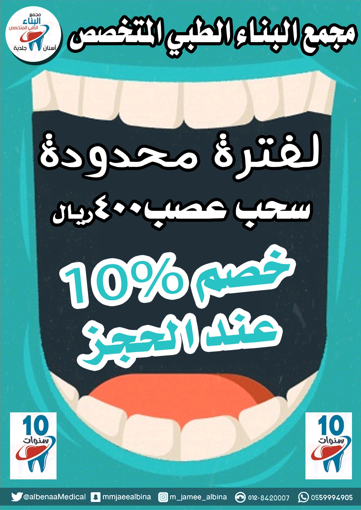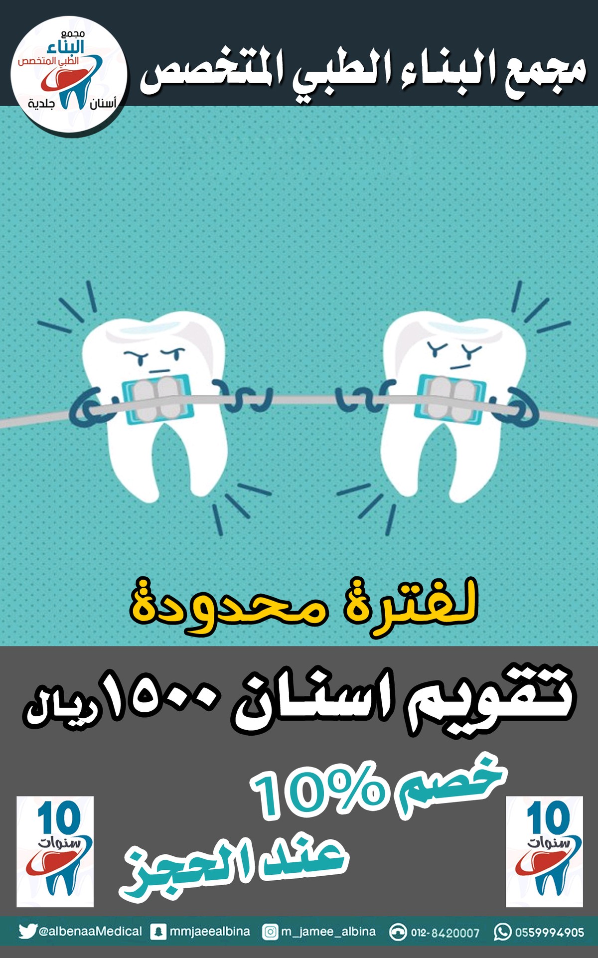 عرض لفترة محدوده خصم 10% عند الحجز سحب عصب 400 خلع 120 تنظيف اسنان 250 تبيض اسنان 700 تركيبات اسنان 500 تقويم اسنان 1500 علاج لثة 1000 حافظ مسافات بسمة هوليود 1200 عدسات 1200 معالجة سنيه600 ليزر550 خصم 10% عند الحجز 0559994905 https://i.suar.me/XqGBZ/l https://i.suar.me/P09M2/l https://i.suar.me/Wl0BQ/l https://i.suar.me/pzr19/l |