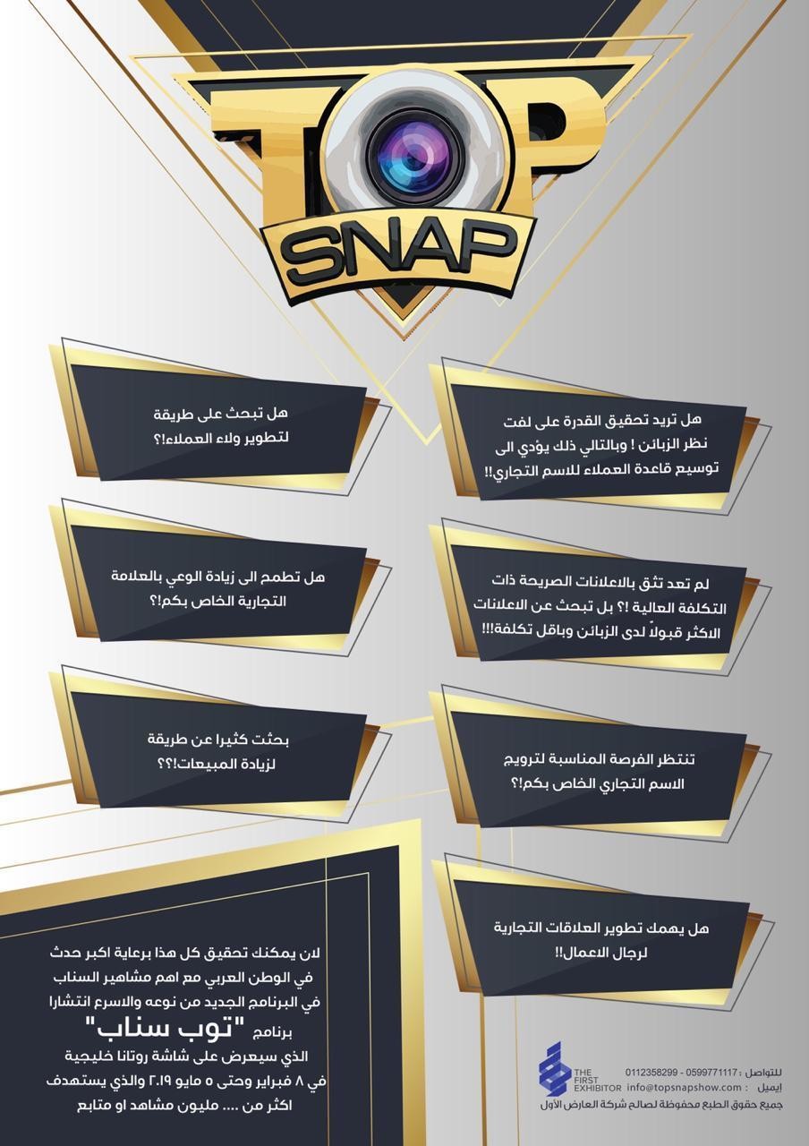 برنامج البث التلفزيوني ( توب سناب )، حيث أنه أضخم برنامج مسابقات لمشاهير السناب والأول من نوعه في الخليج والعالم . يُنقل من خلاله تطبيق الـ "سناب شات" إلى الشاشة الكبيرة في فكرة جديدة ومبتكرة. كانت القناة التي يتجاوز متابعيها الملايين روتانا خليجية قد بدأت بالتعاقد مع المؤثرين على هذا التطبيق في منطقة الخليج، والذي يتجاوز عدد متابعي كلٍّ منهم المليون شخص، لتضمّهم إلى أسرة البرنامج الذي يهدف إلى تشجيع المواهب الشابة وإبتكار المضمون الخلّاق، والترويج لمواقع عدّة حول المملكة. يُعد هذا البرنامج الفرصة الأمثل للإنتشار والتوعية للعلامات التجارية . من المقرر أن يبدأ عرض البرنامج في الفصل الأول من العام الحالي ( من 8 فبراير إلى 5 مايو ) . فإن أي عمل إيجابي مثل رعاية هذا البرنامج، سيصبّ حتماً في تحقيق جانب من رؤية ( 2030 ) للمملكة العربية السعودية. نسعد بتواصلكم وتلبية إستفساراتكم بأي وقت. 1-مسابقة top snap show انتظرونا قريبا على شاشة روتانا خليجية البرنامج الأضخم بنسخته الأولي لمشاهير سناب شات 2-لكل محبى المتعة والاثارة والتشويق تابعوا مسابقة top snap show على قناة روتانا خليجية البرنامج الأضخم بنسخته الأول لمشاهير سناب شات أطيب الأمنيات والتقدير دمتم بود لمزيد من المعلومات الأتصال على الرقم 0599771117 أو 00966112358299 https://topsnapshow.com/ https://www.instagram.com/topsnapshow/ https://twitter.com/topsnapshow https://www.facebook.com/Topsnapshow...dmin_todo_tour https://i.suar.me/8E5QE/l https://i.suar.me/3N8M4/l https://i.suar.me/rNnzJ/l https://i.suar.me/oJ7K1/l |